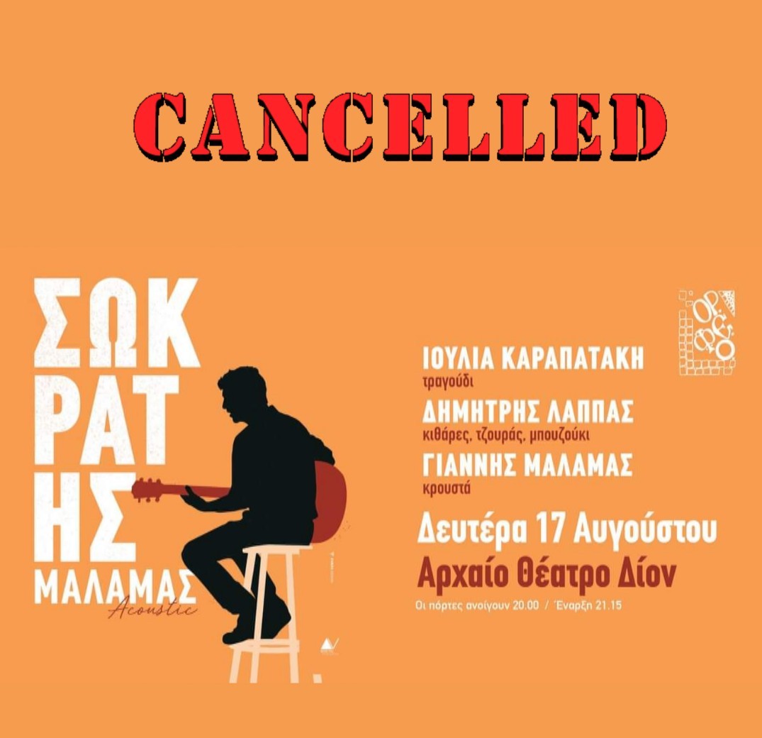 Ο Οργανισμός Φεστιβάλ Ολύμπου αποφάσισε να προχωρήσει στην ματαίωση όλων των μουσικών εκδηλώσεων του. Ως εκ τούτου η προγραμματισμένη συναυλία του Σωκράτη Μάλαμα στο αρχαίο Θέατρο Δίου ακυρώνεται.