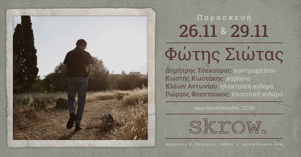 Έχοντας ολοκληρώσει το δεύτερο προσωπικό δίσκο του «Δύο Λάθη», και πάλι σε στίχους του Θοδωρή Γκόνη, ο Φώτης Σιώτας μαζί με τον Δημήτρη Τσεκούρα στο μπάσο, τον Κλέων Αντωνίου στην κιθάρα, αλλά και τους Κωστή Κωστάκη στην χαβάγια και Γιώργο Φουντούκο στην κλασική κιθάρα, καταλαμβάνουν τη θεατρική σκηνή του Skrow για δυο ιδιαίτερες συναυλίες σε περιορισμένο κοινό.