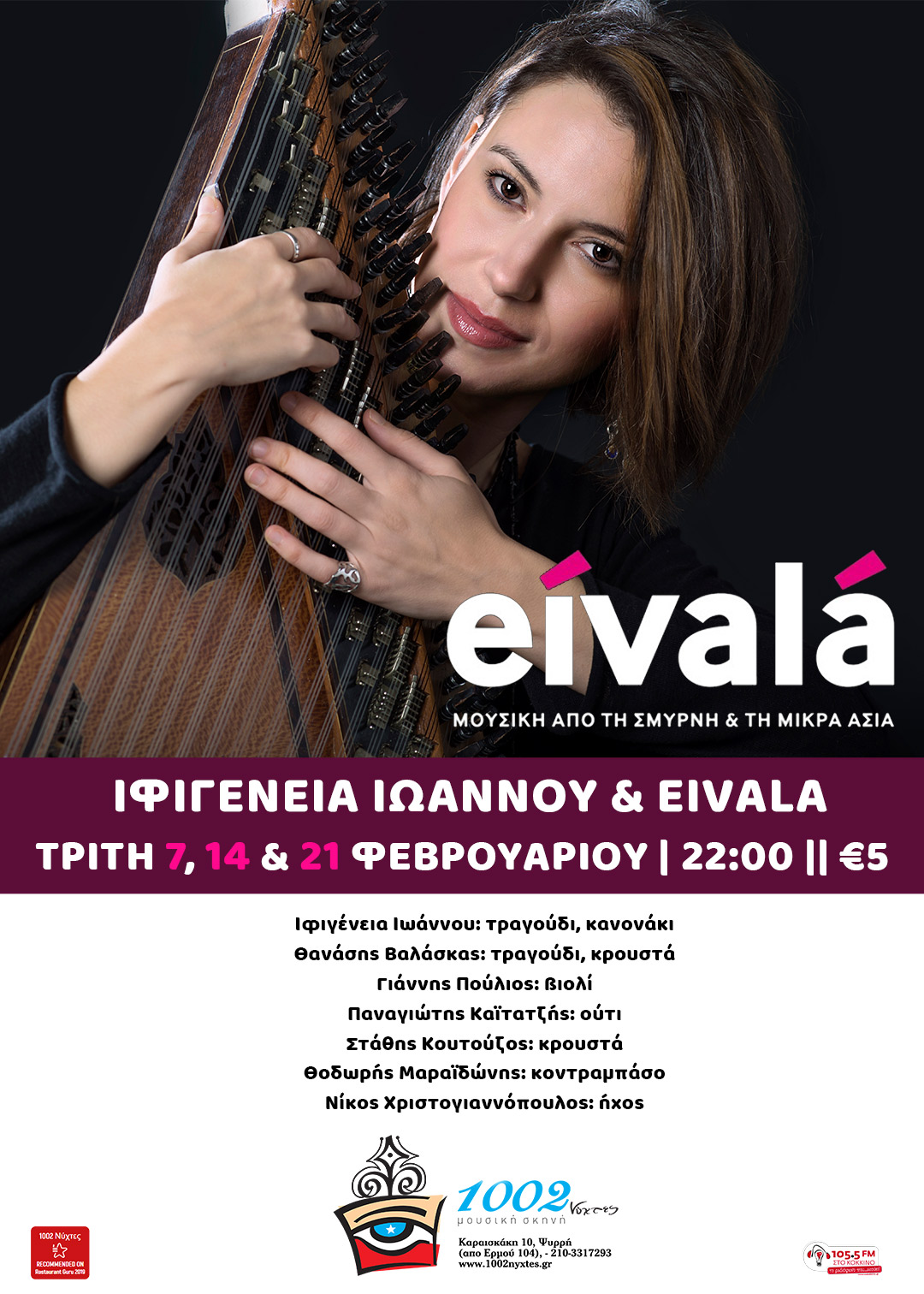 Το μουσικό σχήμα ❝Ιφιγένεια Ιωάννου & Eivala❞ επισκέπτονται το ιστορικό «1002 Νύχτες» στου Ψυρρή για 3 εμφανίσεις, στις 7, 14 & 21 Φεβρουαρίου. Φέρνουν μαζί τους μουσικές και τραγούδια που «μυρίζουν» Σμύρνη & Πόλη του 19ου– 20ου αιώνα και υπόσχονται ένα παραδοσιακό Σμυρναίικο γλέντι στη καρδιά της Αθήνας.