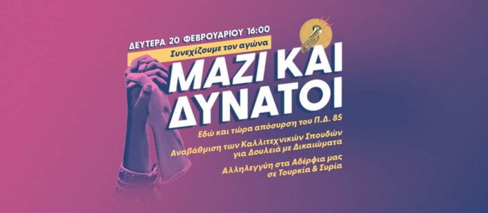 𝝡𝝚𝝘𝝖𝝠𝝜 𝝨𝝪𝝢𝝖𝝪𝝠𝝞𝝖 𝝙𝝚𝝪𝝩𝝚𝝦𝝖 𝟮𝟬 𝝫𝝚𝝗𝝦𝝤𝝪𝝖𝝦𝝞𝝤𝝪 𝝚𝝝𝝢𝝞𝝟𝝤 𝝝𝝚𝝖𝝩𝝦𝝤 – 𝝟𝝩𝝞𝝦𝝞𝝤 𝝩𝝨𝝞𝝠𝝠𝝚𝝦 Συνεχίζουμε τον αγώνα 𝞛𝞐𝞕𝞘 𝞙𝞐𝞘 𝞓𝞤𝞜𝞐𝞣𝞞𝞘! ▶️ Απόσυρση του ΠΔ.85 εδώ και τώρα! ▶️ Αναβάθμιση των Καλλιτεχνικών Σπουδών για δουλειά με δικαιώματα ▶️ Αλληλεγγύη στ’αδέρφια μας σε Τουρκία και Συρία Μαζεύουμε τρόφιμα & είδη πρώτης ανάγκης Οι συμμετοχές συνεχίζονται! Alex Sid Βελεσιωτου Φ. Γκοτσόπουλος Δ. … Συνεχίστε να διαβάζετε το ΜΑΖΙ ΚΑΙ ΔΥΝΑΤΟΙ | ΜΕΓΑΛΗ ΣΥΝΑΥΛΙΑ ΤΗ ΔΕΥΤΕΡΑ 20 ΦΕΒΡΟΥΑΡΙΟΥ.