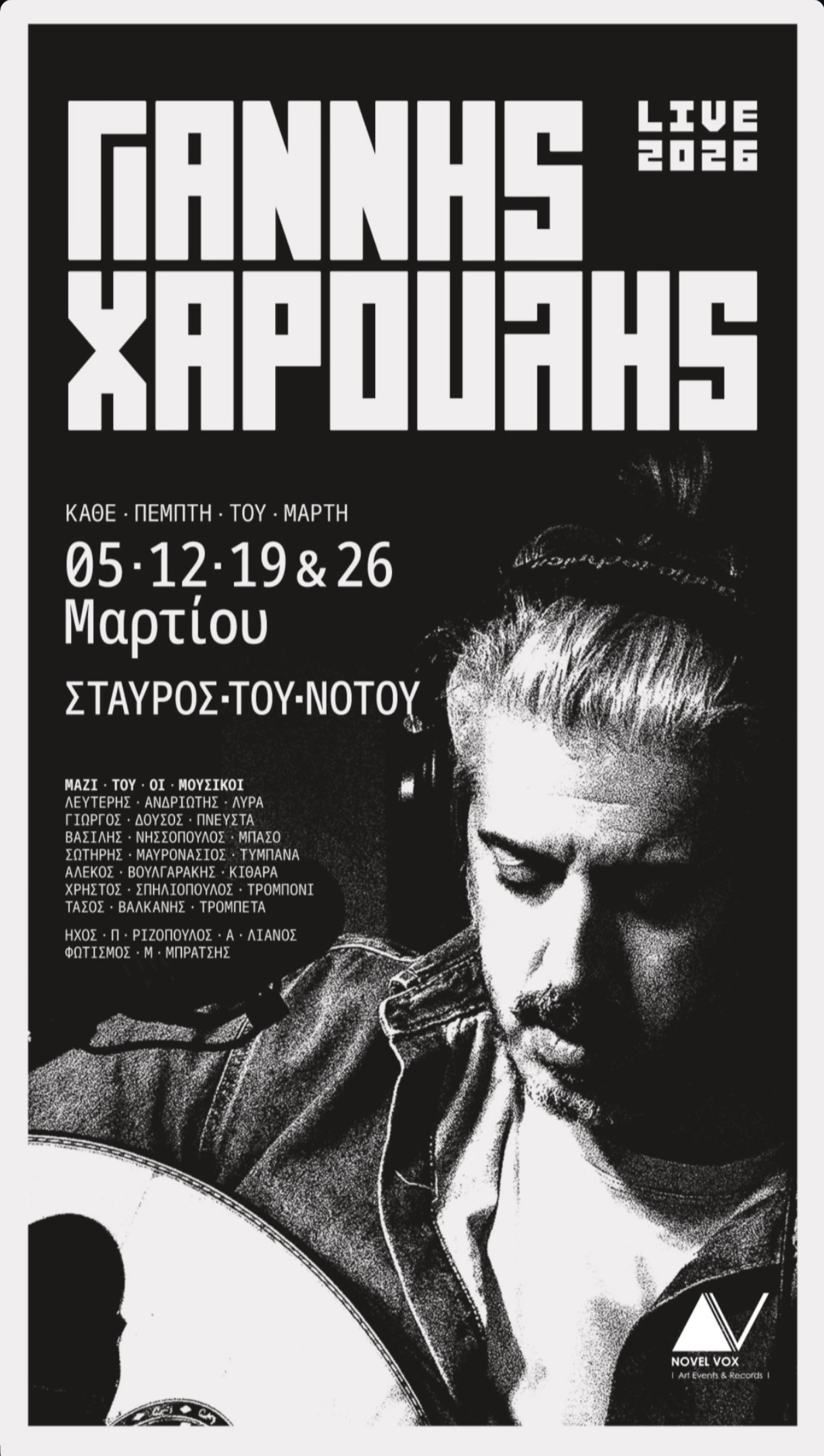 Ο Γιάννης Χαρούλης επιστρέφει στην Κεντρική Σκηνή του Σταυρού του Νότου, εκεί που χτυπάει δυνατά η μουσική καρδιά της πόλης, δεκατρία χρόνια μετά, για 4 μόνο εμφανίσεις, όλες τις Πέμπτες του Μαρτίου.