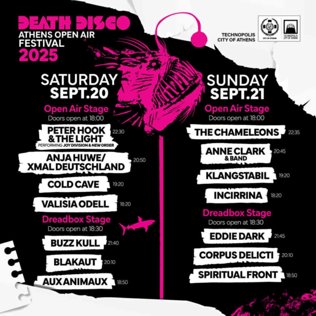 Με headliners την Νew Wave ποιήτρια και προτεργάτρια της ηλεκτρονικής μουσικής Αnne Clark από τη μία, και τον Peter Hook, τον ίσως σημαντικότερο μπασίστα όλων των εποχών και τον μοναδικό άνθρωπο στη γη που κρατάει ζωντανό το πνεύμα των Joy Division, μαζί τη θρυλική Anja Huwe και τους XMal Deutschland, τους κλασικούς Βρετανούς post-punk The Chameleons, τους Cold Cave και άλλους σημαντικούς καλλιτέχνες και τους καλύτερους εκπροσώπους της ελληνικής σκηνής (Eddie Dark, Incirrina, Valisia Odell, Blakaut), το Death Disco βάζει τις βάσεις για ένα διήμερο open air festival που δεν πρέπει να χάσεις.