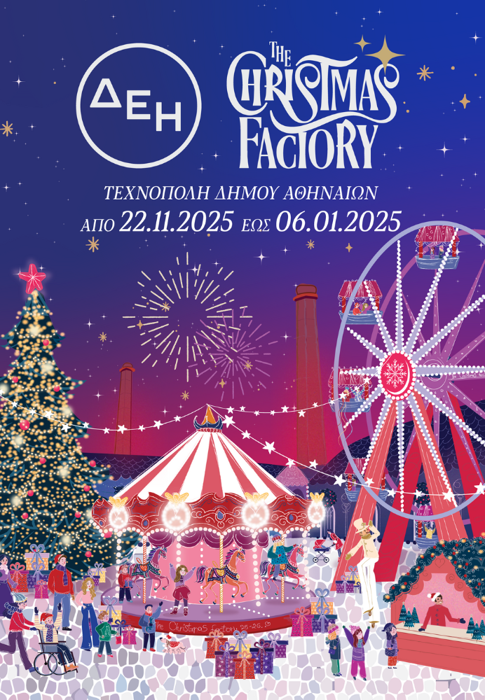 Κάθε χρόνο, όταν ο χειμώνας πλησιάζει, ένα γνώριμο φως αρχίζει να απλώνεται πάνω από την Τεχνόπολη Δήμου Αθηναίων. Είναι το φως του ΔΕΗ CHRISTMAS FACTORY, που εδώ και δώδεκα χρόνια μεταμορφώνει την καρδιά της πόλης σε ένα ολόκληρο χριστουγεννιάτικο σύμπαν — έναν τόπο δημιουργίας, φαντασίας και συνάντησης για μικρούς και μεγάλους.